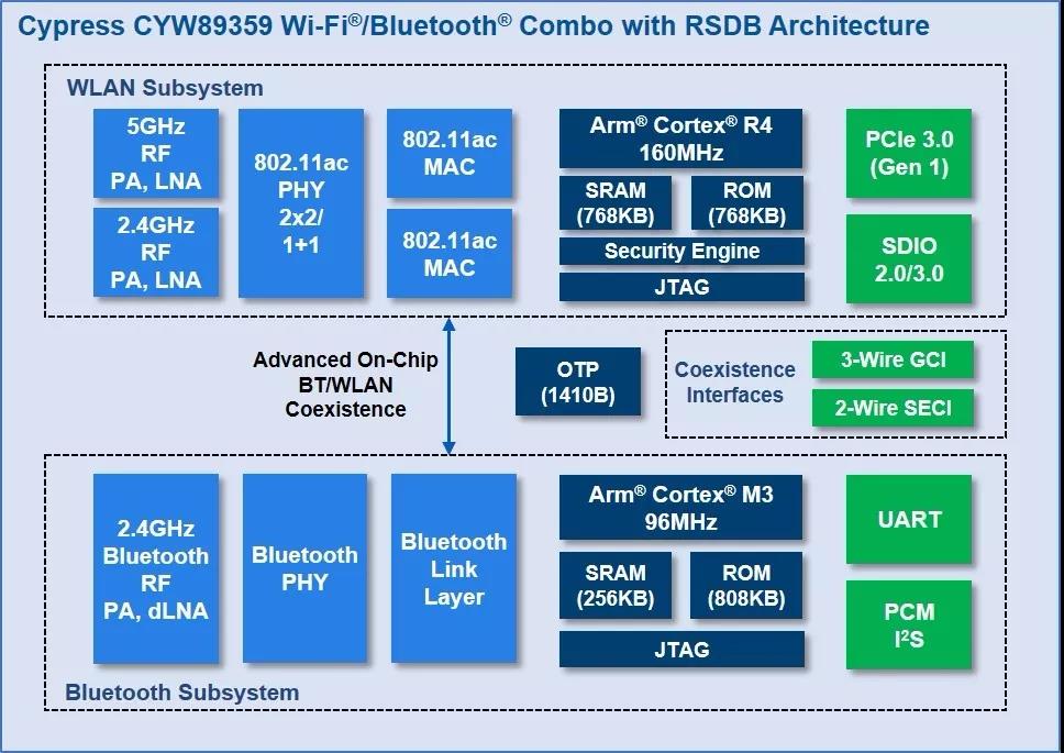 賽普拉斯CYW89359 Combo解決方案是業內率先使用實時同步雙頻帶(RSDB)技術的產品。它通過將兩個完整的Wi-Fi子系統集成到一塊單芯片中,使兩個獨立的數據流能夠同時以全吞吐量運行。先進的2.4-GHz Wi-Fi和藍牙共存引擎可同時為2.4-GHz和5-GHz 802.11ac Wi-Fi及雙模藍牙/低功耗藍牙(BLE)提供最佳性能。