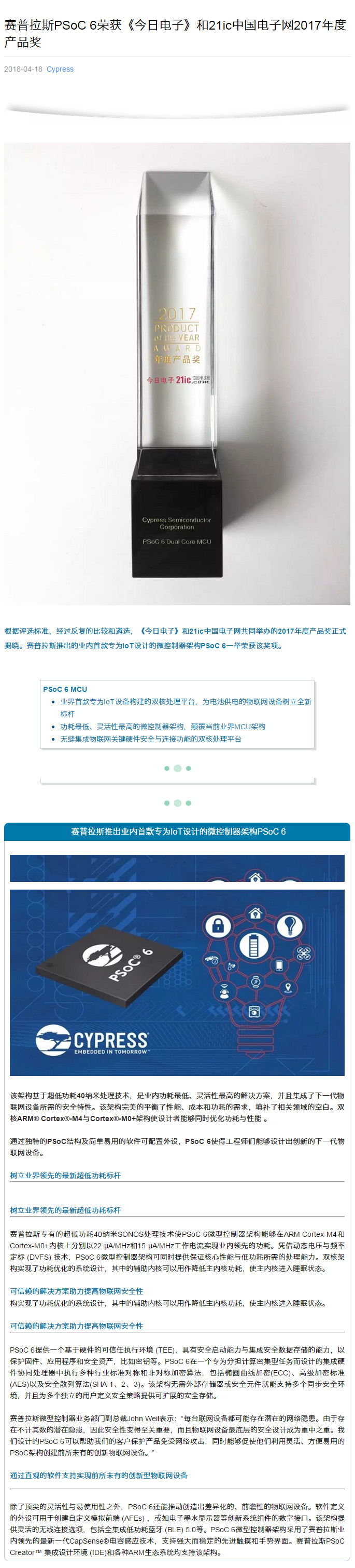 | 賽普拉斯推出業(yè)內(nèi)首款專為IoT設(shè)計的微控制器架構(gòu)PSoC 6 |